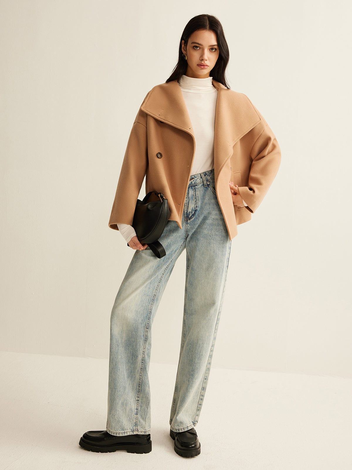 • Elegante Details: Eine doppelte Knopfleiste und ein großer, offener Kragen verleihen dem Mantel eine besondere Note.