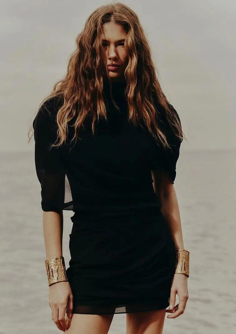 Carmen | Schwarzes Drapé-Minikleid mit hoher Schulterpartie