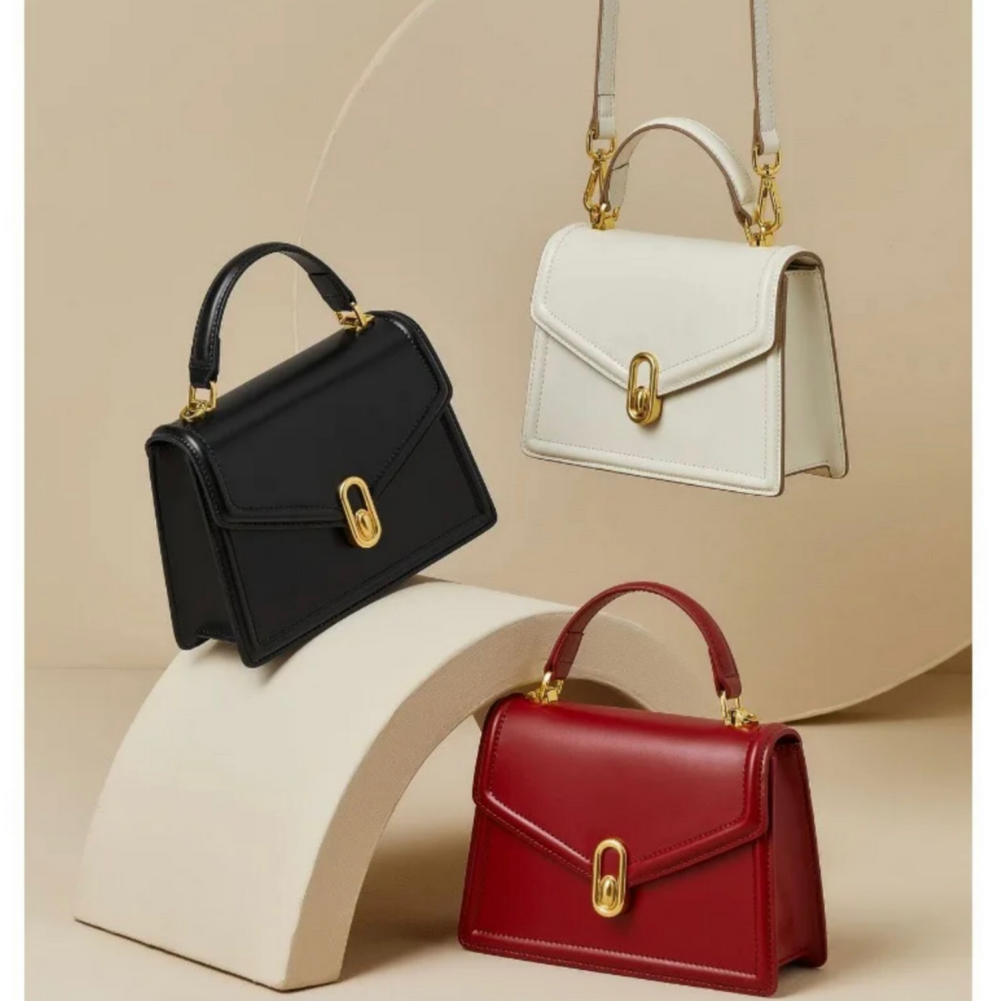 Die Elena Handtasche ist eine kompakte, elegante Begleiterin für stilvolle Auftritte – ob im Alltag oder bei besonderen Anlässen. Ihre klare Silhouette, kombiniert mit hochwertigem Kunstleder und einem goldfarbenen Verschluss, macht sie zum edlen Highlight für jedes Outfit.