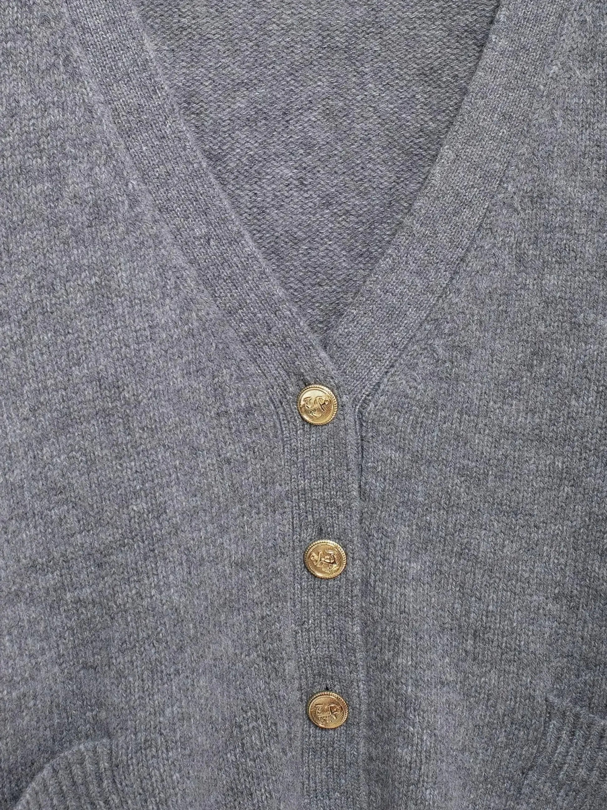Werten Sie Ihren Alltagsstil mit dieser Leona Strickjacke mit V-Ausschnitt auf, die mit eleganten goldfarbenen Knöpfen und einem zeitlosen Design überzeugt. Mit ihrer lockeren Passform und praktischen Vordertaschen vereint diese Strickjacke Raffinesse und Komfort und wird so zu einem unverzichtbaren Kleidungsstück für lässige und elegante Outfits.