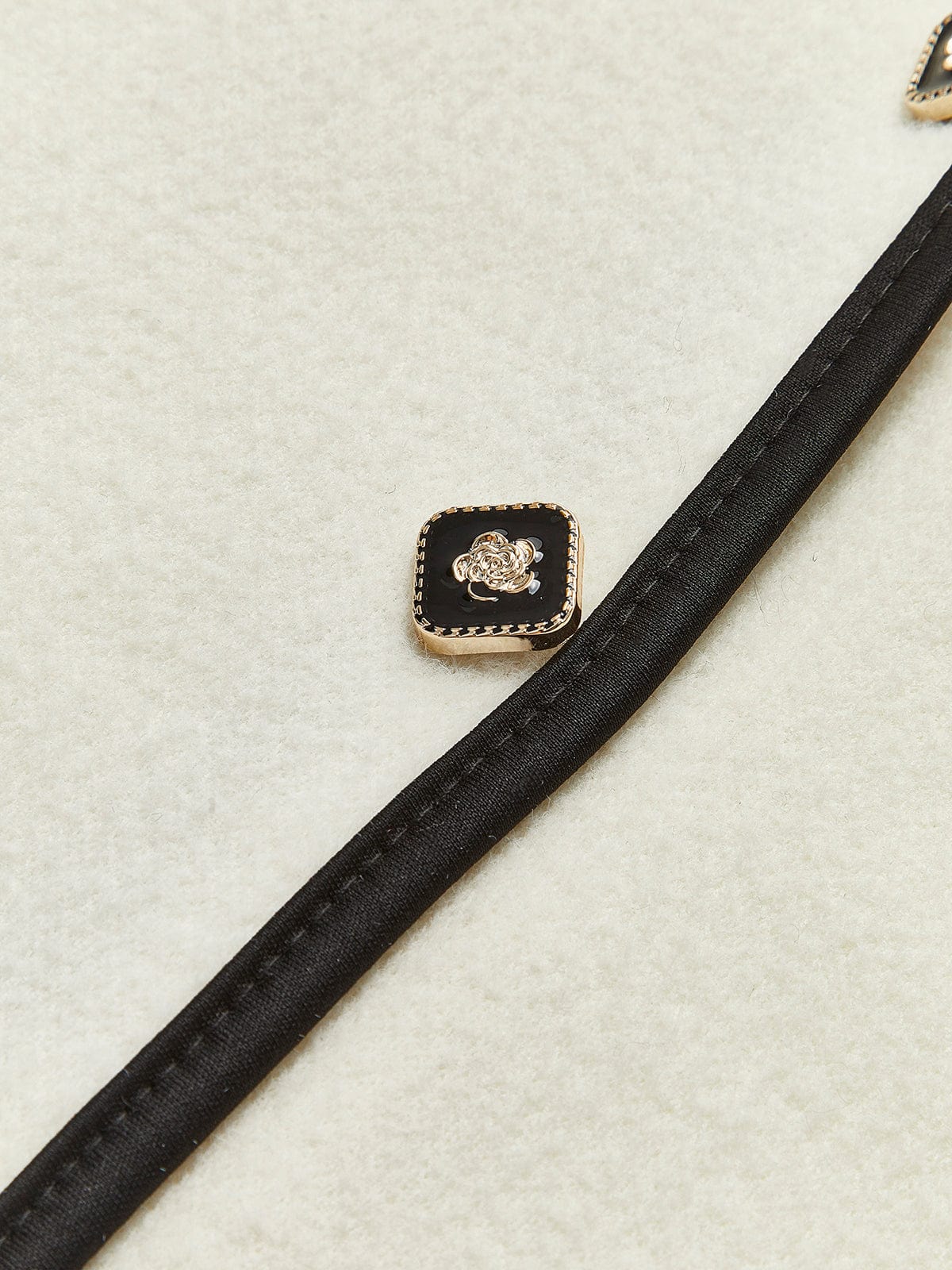 Verleihen Sie Ihrem Stil mit dieser schicken weißen Cardiganjacke einen Hauch von Eleganz. Sie besticht durch den raffinierten schwarzen Kontrastbesatz, einen klassischen Kragen und stilvolle Knopfdetails. Mit zwei Fronttaschen und modischen Manschetten ist dieses vielseitige Stück die perfekte Wahl für sowohl legere als auch formelle Looks und ein unverzichtbares Must-have für alle Jahreszeiten.