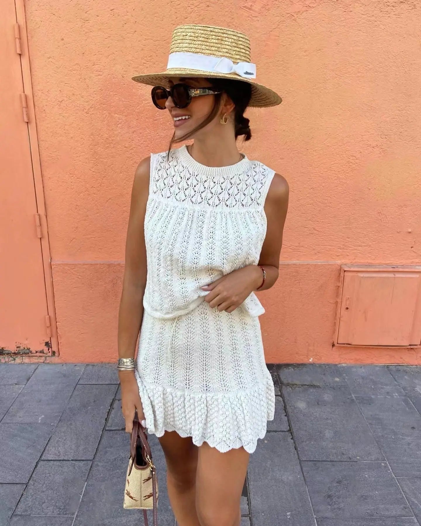Dieses sommerliche zweiteilige Set besteht aus einem ärmellosen Häkeloberteil und einem dazu passenden Rüschenrock. Der luftige, offen gestrickte Stoff macht es zum perfekten Outfit für heiße Tage, während die feminine Silhouette und die Details für einen eleganten Look sorgen. Dieses Set ist ideal für einen Tagesausflug oder einen sommerlichen Anlass und strahlt mühelosen Stil aus.