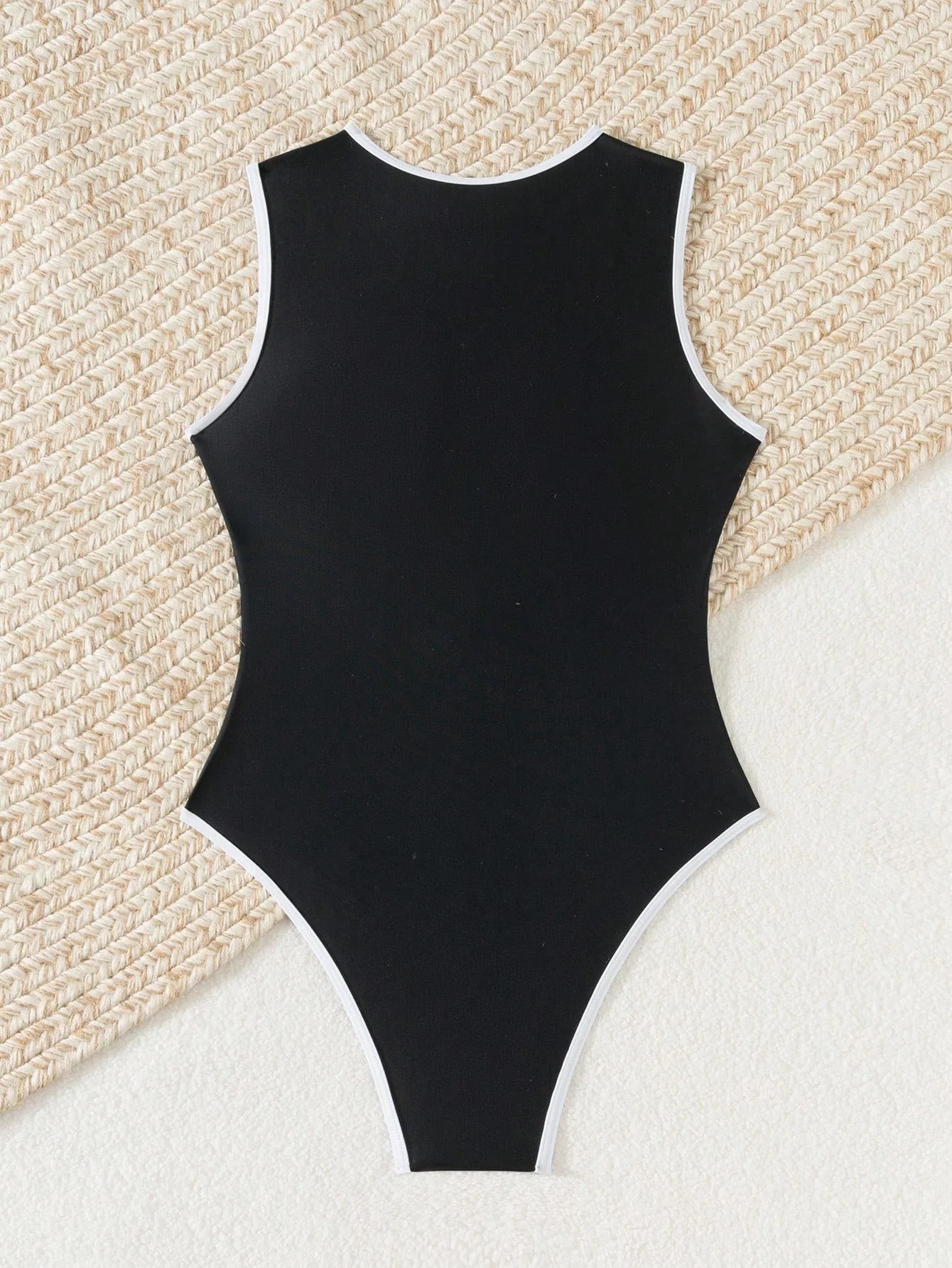 Dieser stilvolle Einteiler vereint sportliches Design mit femininer Eleganz. Der hochgeschlossene Ausschnitt mit funktionalem Reißverschluss und die markante Kontrastbindung sorgen für einen modernen Look, der Sie am Strand, im Wasser oder bei sportlichen Aktivitäten glänzen lässt.